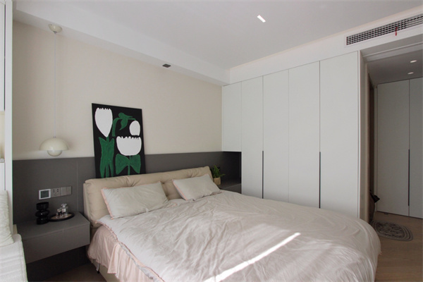 來到主臥,背景墻分為奶咖色和灰色上下兩部分,來增強(qiáng)空間的層次感,奶呼呼的靠背雙人床,搭配一體化的懸空式床頭柜,簡(jiǎn)約中又不失精致。床尾擺放梳妝臺(tái),方便女主人每天早上護(hù)膚、更衣、梳妝。