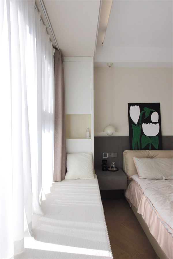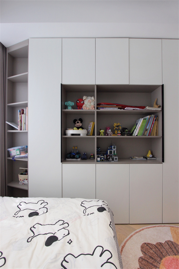 飄窗打造成休閑區(qū),加上軟墊與抱枕,讓空間多出舒適氛圍。飄窗右側(cè)還定制了一列收納柜,放置書本、玩具正合適。
