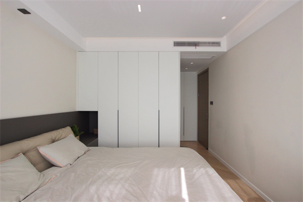 定制收納衣柜,大大提高空間收納力,并且在衣柜延伸出床頭置物區(qū),不僅提高了睡眠區(qū)的隱私性,還代替了傳統(tǒng)床頭柜,一體化的設(shè)計(jì)讓主臥更顯干凈、利落。同時(shí)在主臥門后空間也做了一組通頂衣柜,上部收納換被褥,下部收納當(dāng)季衣物,從而進(jìn)一步提高空間利用率。