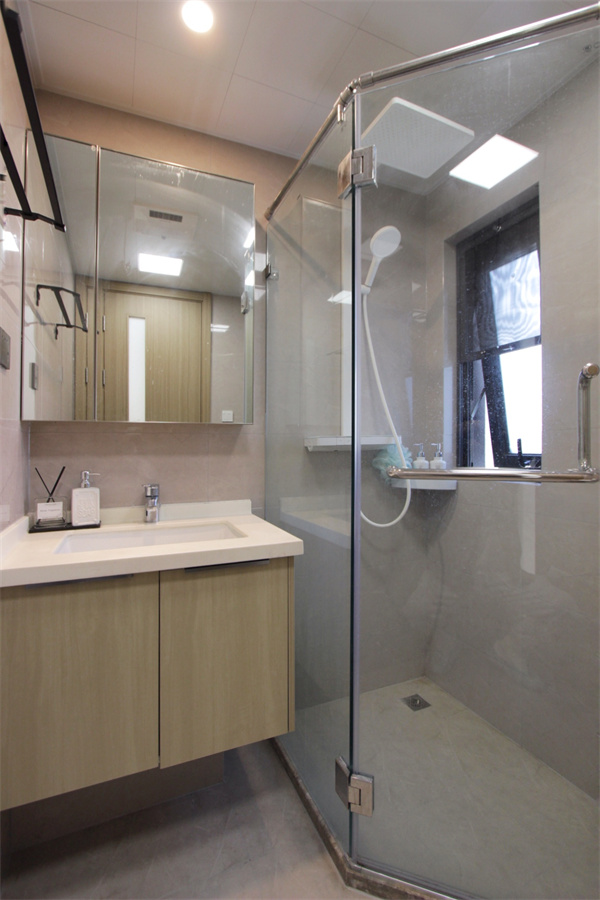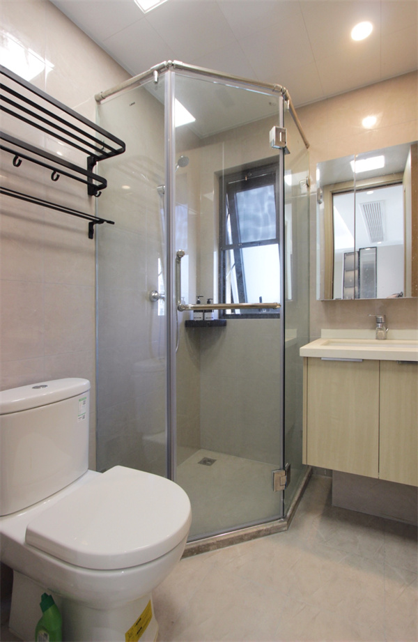 客衛(wèi)的整體設(shè)計(jì)與主衛(wèi)保持了統(tǒng)一,原木色浴室柜、馬桶、淋浴間,淺色墻磚讓空間更顯通透明亮。淋浴間安裝不銹鋼壁龕,加強(qiáng)防水功能,可放置日常洗浴用品。馬桶上方的毛巾架,方便安置毛巾、換洗衣物等。