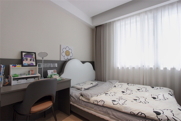 兒童房與主臥裝修采用相同手法,背景墻分成上下兩部分,起到很好的呼應(yīng)作用。云朵造型床頭,加上童趣感床品,讓室內(nèi)洋溢著可愛溫馨的氛圍。床側(cè)配備灰色書桌,加上精致的擺飾品與讀物,為小主人提供了實(shí)用舒適的學(xué)習(xí)與睡眠環(huán)境。