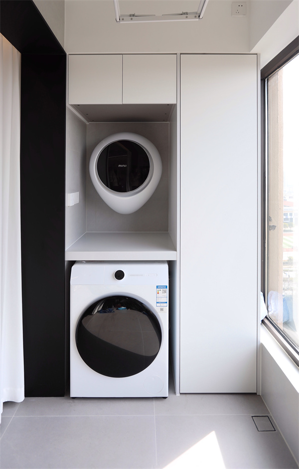 陽臺一側定制收納柜,將洗衣機嵌入其中,顯得陽臺更加整齊與整潔。另外安裝了壁掛式迷你洗衣機,分類洗滌更輕松,進一步解放雙手。