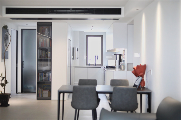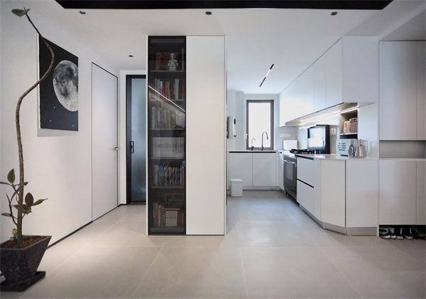 拆除廚房局部墻體,改造成L型定制柜,位于過道中間。可以是書柜,也可以是酒柜,讓過道的實用性增強。