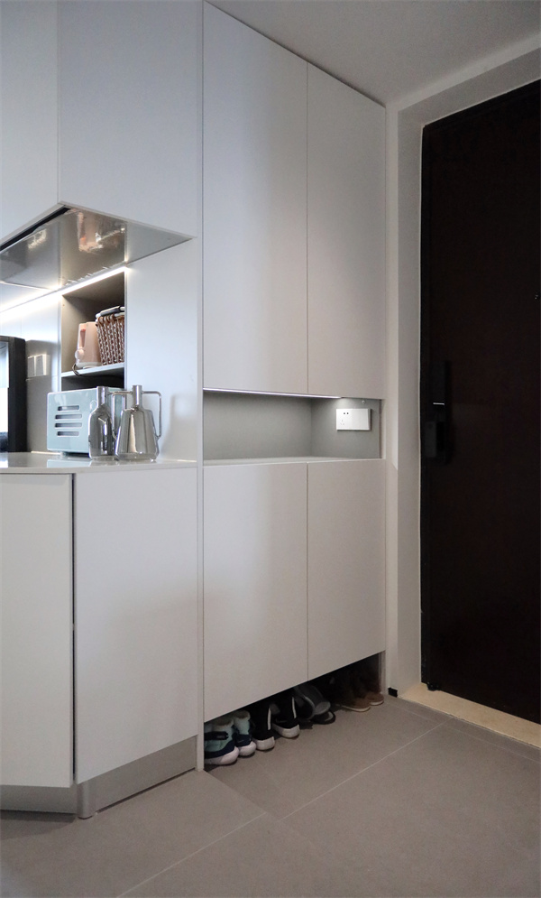 設計師將玄關與廚房一體設計,既滿足了儲物需求,又保持了整體的協調美觀。頂天立地的玄關柜,收納能力MAX。中部鏤空用以放置飾品或隨手物品;底部懸空設計,可供日常方便換鞋。