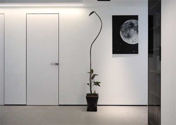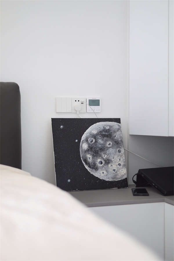 過道盡頭布置一盆綠植和裝飾畫,不僅能夠裝飾走廊,還能夠美化家居環境,讓走廊瞬間變得有格調。墻上的星球畫是女主人自己創作的,客人一進門就能看到它,帶來濃濃的藝術氣息。