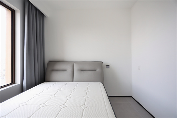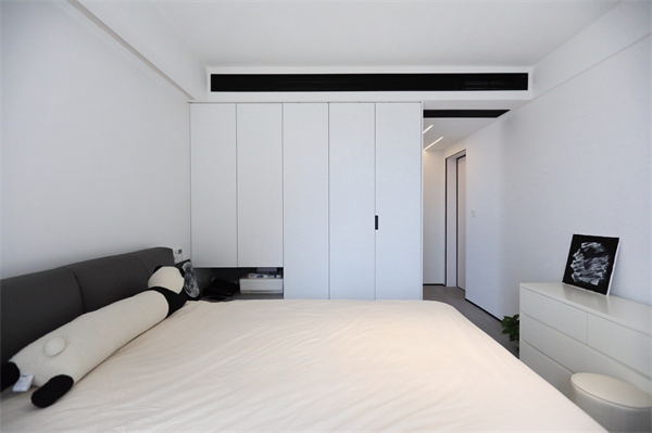 主臥空間遵循極簡風格,自然也是大面積的白色空間,灰白配,不得不說經典總是有理由的。衣柜更是為主臥帶來了豐富的收納空間,視覺上也給人一種干凈利落的感覺。無主燈設計,讓空間顯得簡潔明亮而大方。