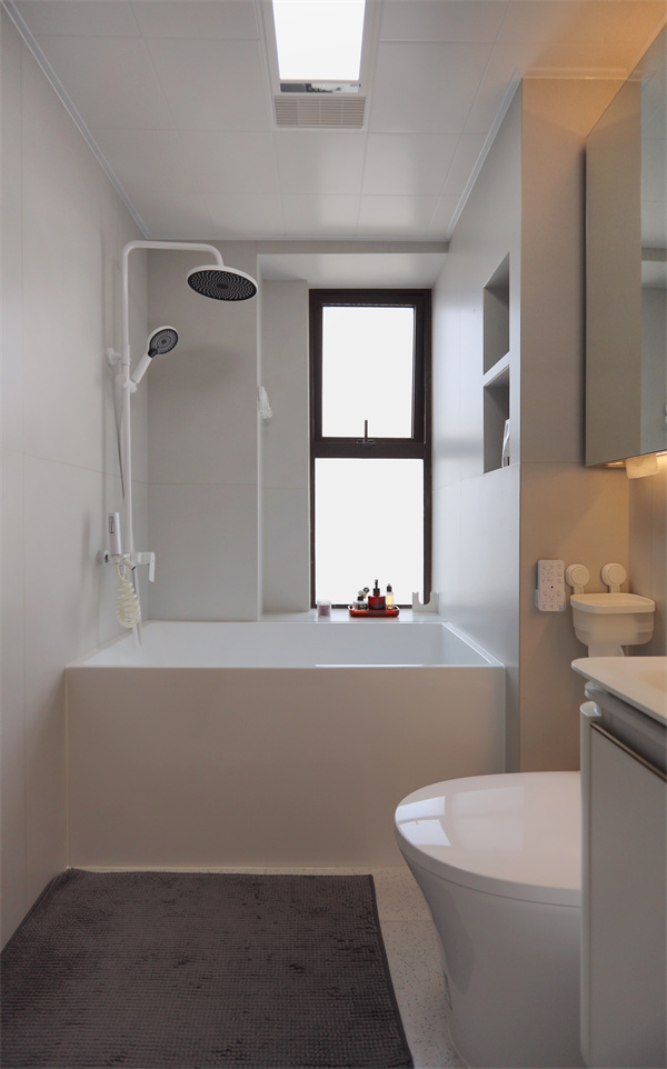 主衛根據業主的要求,設計的簡約實用,以浴室柜、馬桶和浴缸這三大件為主。淋浴區設計了浴缸+淋浴的組合,提高空間利用率,非常節省空間。上方鏡柜可收納女主人的洗漱、護膚、梳妝用品,全方位燈帶環繞,再也不用抹黑化妝。淋浴區墻面定制壁龕,可放置泡澡用品,拿取方便。