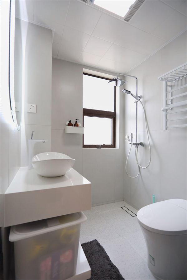 純白色的客衛空間,馬桶、浴室柜、淋浴區簡單布局,在保證功能性的基礎上,又不會讓人感覺壓抑。白色大理石臺面盡顯優雅氣質,懸浮設計很好的避免了衛生清潔死角。墻面安裝發光浴室鏡,方便日常梳洗打扮。