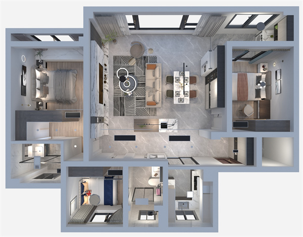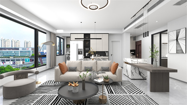 本案是一套面積為117㎡的三居室,屋主一家五口,三代同堂。對于空間的需求,屋主希望在設計能突破風格定義,并遵循居住舒適性為核心,營造出一個其樂融融的生活畫面。深入溝通需求,并結合業(yè)主喜好,設計師將全屋風格定義為現代風格,客餐廳+島臺一體化設計,使整體空間格局更大、視野更開闊,妥妥的大宅范兒。
