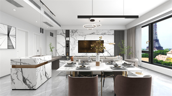 客餐廳+島臺一體化布局設計,讓室內擁有了更為寬敞的空間和更為開闊的視野,采光也因此變得更好了。電視背景墻也成為了一大焦點,木格柵打底拼鋪大理石,高級顯檔次,并且加入燈帶的設計,更是將氛圍感拉滿。下沿采用了抬高處理,可充當置物臺,不為儲物只為擺放裝飾品。