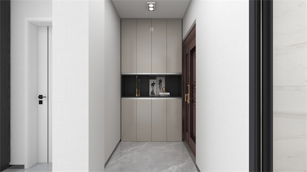 進門右側定制玄關柜滿足收納,也起到過渡空間的作用。極簡柜門+無拉手設計,存在感幾乎為零。