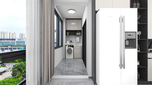 雙聯動陽臺,連接客廳與次臥,增加了陽臺區(qū)域的活動性,采光更加充足。 陽臺柜+內嵌洗衣機是黃金搭檔,洗衣、晾曬、收納一氣呵成。