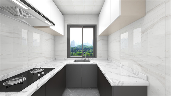 廚房采用經典U型設計,讓洗滌區(qū)、烹飪區(qū)等操作臺面在空間劃分及其明確,操作動線無縫銜接,更加合理舒適。