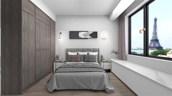 主臥沿用客廳色調,簡約素雅。溫潤的木質、柔軟的布藝、精致的壁燈,不同材質在此結合,以點與線的層次遞進,給予視覺與觸覺雙重享受。