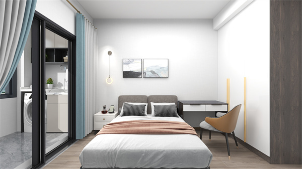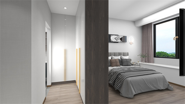 主臥巧用衣柜隔開一個過道,做步入式衣帽間,加強收納空間,既化解了衛(wèi)生間門對著床的禁忌,又使空間有各自的功能性。