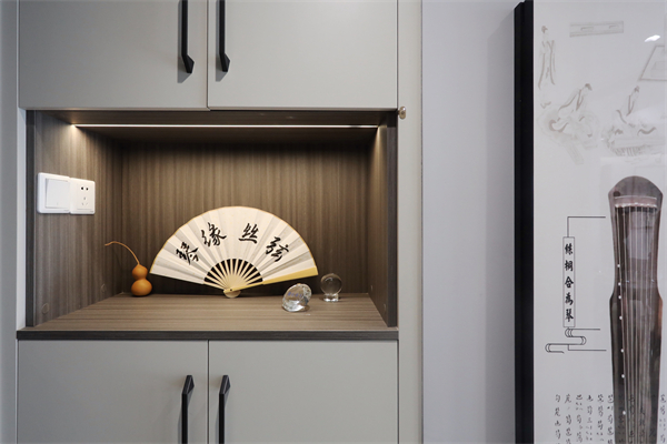 一把寫(xiě)著“琴緣絲弦”的折扇迎接著主人歸來(lái),一側(cè)掛畫(huà)訴說(shuō)著絲弦與琴的典故。