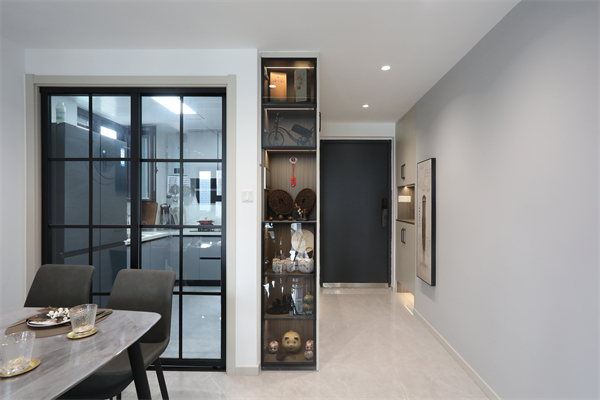 長(zhǎng)廊型玄關(guān),由筒燈延伸入內(nèi),玄關(guān)柜另一側(cè)做開(kāi)放格展示柜,為空間與空間之間形成過(guò)渡,更豐富了空間層次。