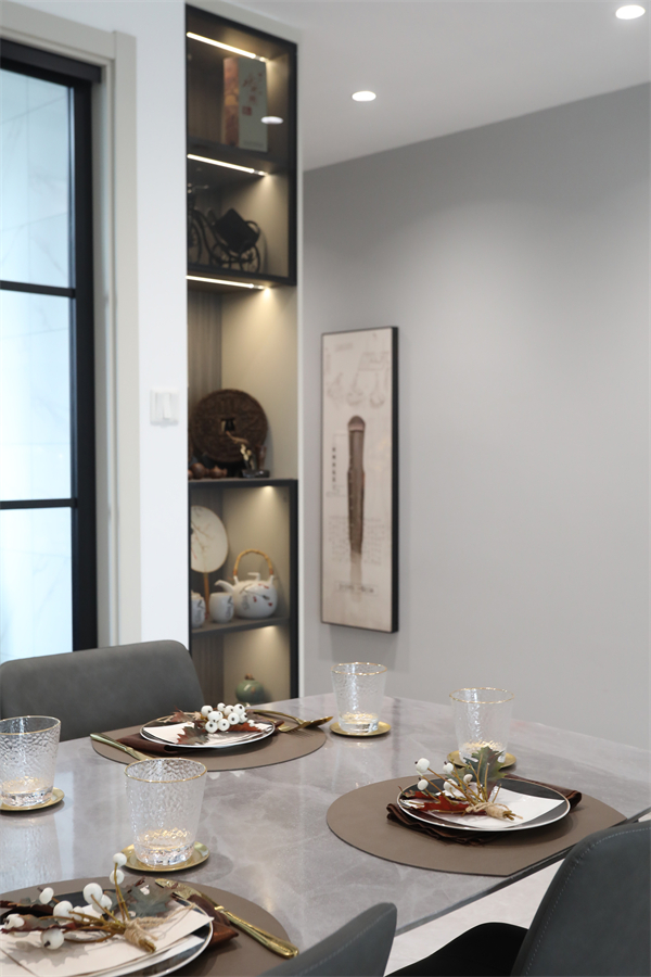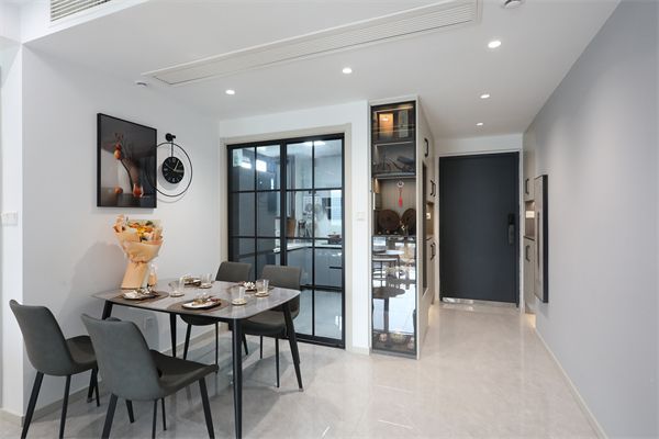 餐廳設(shè)計(jì)于廚房移門(mén)外,連接著廚房與客廳,流暢的格局動(dòng)線,便于出餐與用餐。
