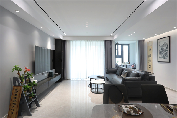 電視墻面由玄關(guān)延伸入內(nèi),為一個(gè)整體,在視覺(jué)上顯得整個(gè)空間的銜接十分流暢,視覺(jué)上也有一種延伸感。