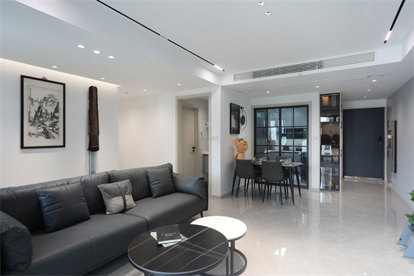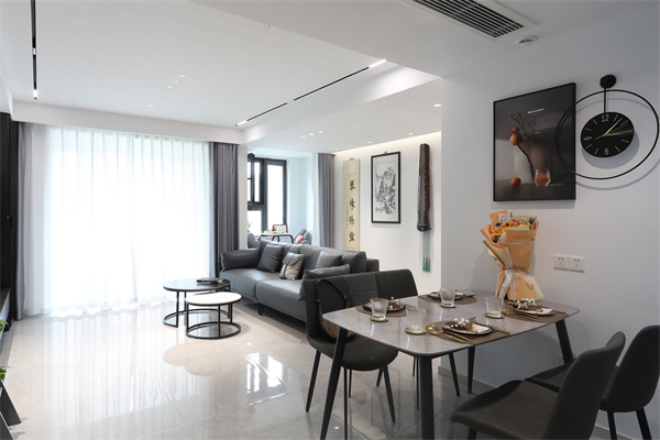 玄關(guān)到客廳地面采用通鋪大理石瓷磚,整體無(wú)主燈設(shè)計(jì)使空間更為簡(jiǎn)約。