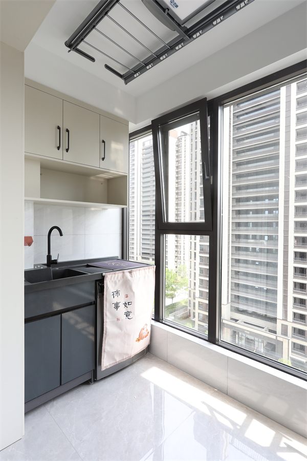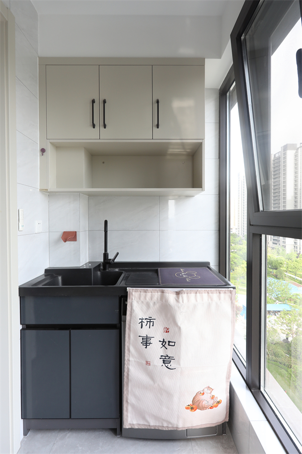 陽(yáng)臺(tái)只做一側(cè)功能區(qū),包含了收納與洗滌,上淺下深的柜體組合,定位簡(jiǎn)約的陽(yáng)臺(tái)風(fēng)格。