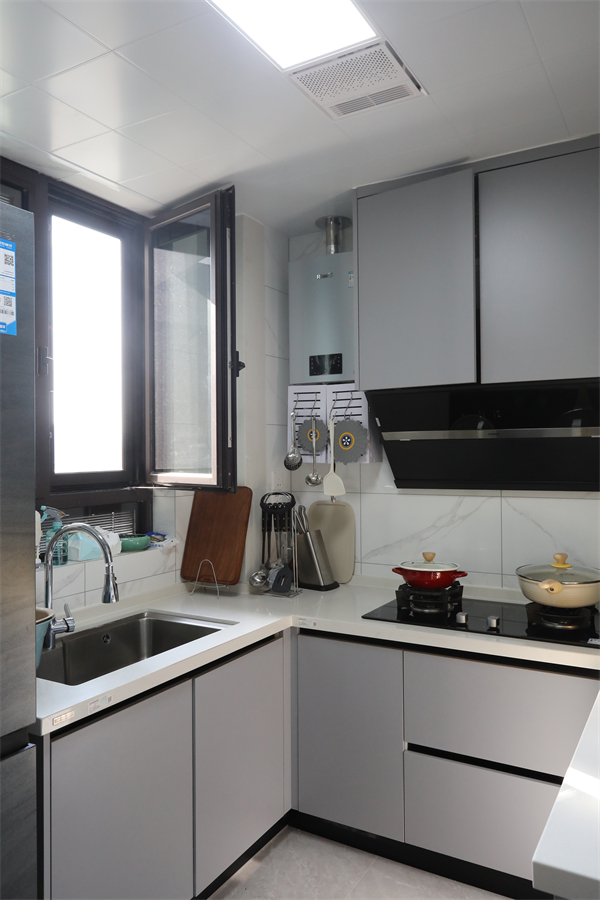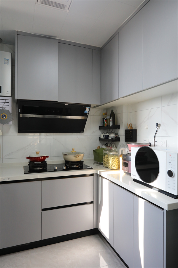 中國(guó)人的情感,始終圍繞在廚房的煙火氣中,屋主愛(ài)好美食,對(duì)廚房要求自然比較高,U型廚房的設(shè)計(jì),烹飪操作起來(lái)非常方便。