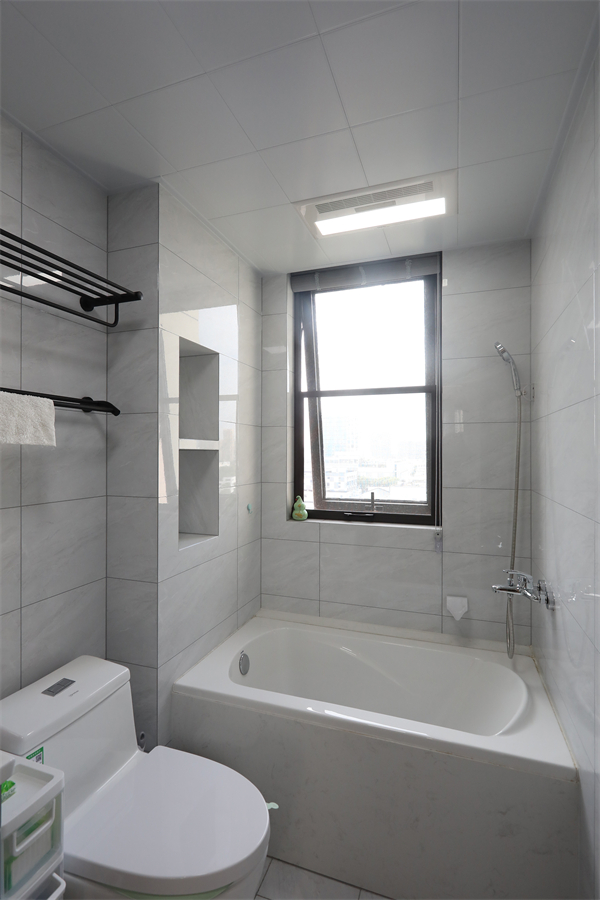 內(nèi)衛(wèi)設(shè)有浴缸,將生活儀式感拉滿(mǎn),整體鋪貼白色瓷磚,使衛(wèi)生間看起來(lái)更加潔凈。