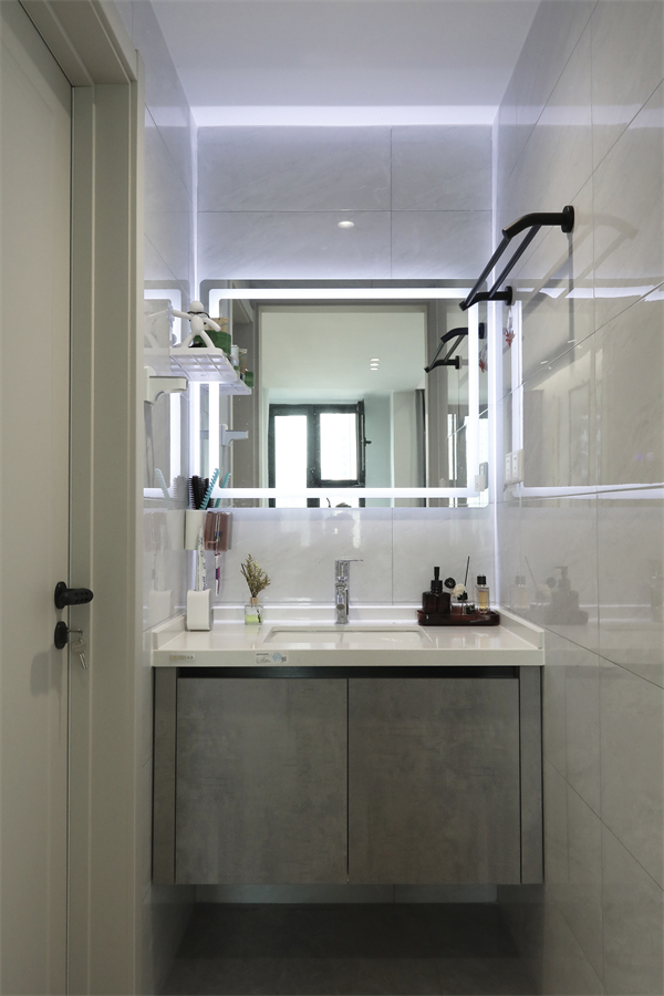 臺(tái)下盆的設(shè)計(jì)使臺(tái)面更加整潔統(tǒng)一,鏡面燈加上邊燈帶,映襯得洗漱區(qū)通透明亮。