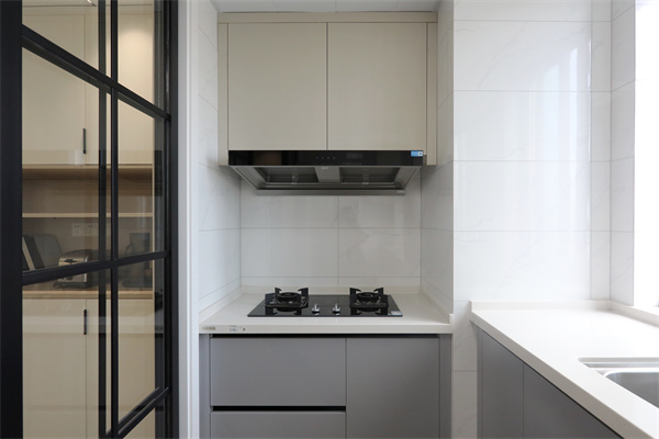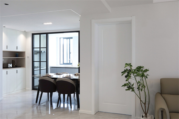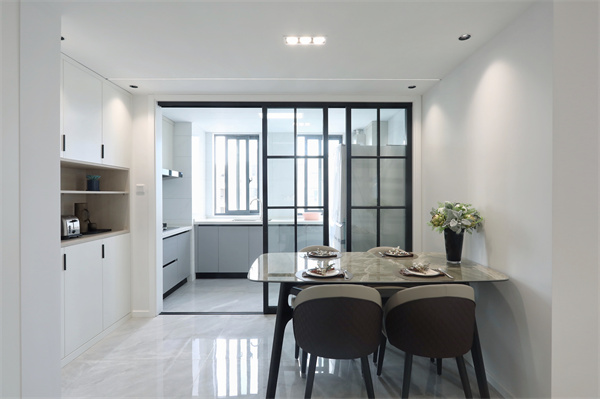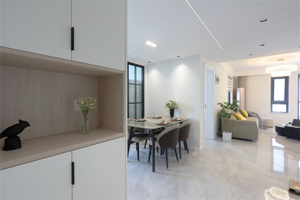 餐邊柜連靠墻設計,利用玄關背部與廚房之間的立面空間,干凈素雅,將雜亂藏進其中。