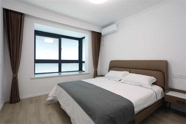 次臥的床與窗簾采用同色,看起來空間擁有整體性,休閑飄窗臺為臥室引入自然光。