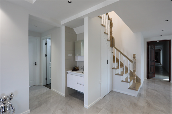衛生間干濕分離,干區臺盆設置于樓梯下,且為內部的臥室區進行了過渡。
