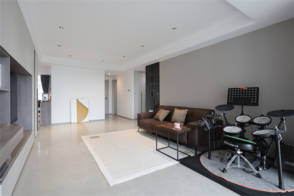 快節奏的都市中,生活更需要慢下來,沙發一側擺放孩子每天都要練習的架子鼓。