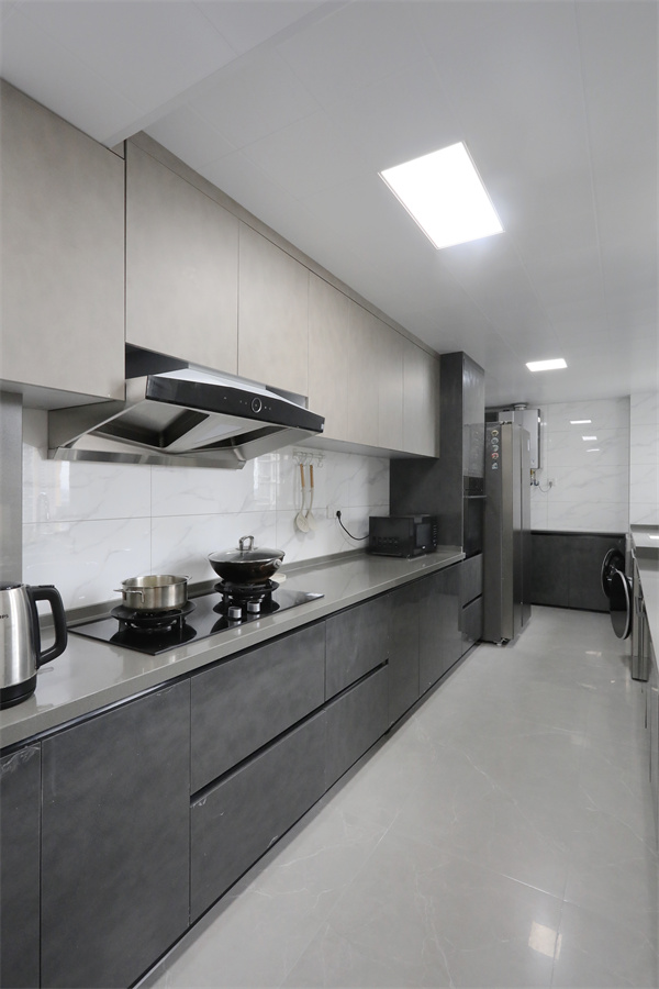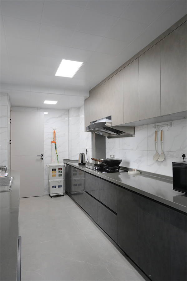 廚房空間根據原始戶型設計,兩側靠邊做廚柜,根據主人的烹飪習慣定制動線。
