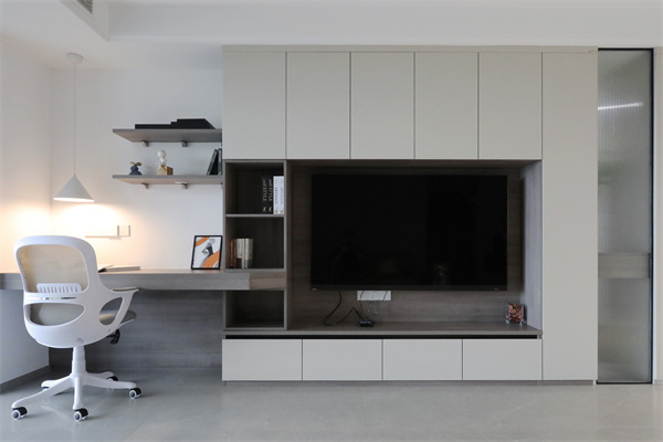 電視柜做整面墻的設計,使之擁有充足的收納空間,定制電視柜連接一側的書桌,讓空間更加的整體化。