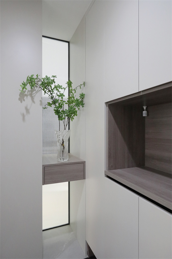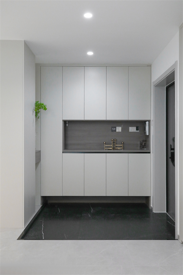 玄關利用墻面空間做玄關柜,中部與底部留空,無門把手的設計更簡約。