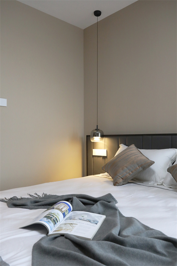 同等色系的床品,也能提升臥室的舒適感,低飽和的裝飾搭配,再利用暖色床頭吊燈做局部照明,營造高貴典雅的氛圍。