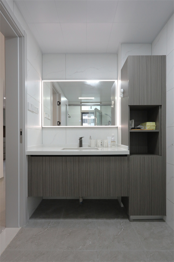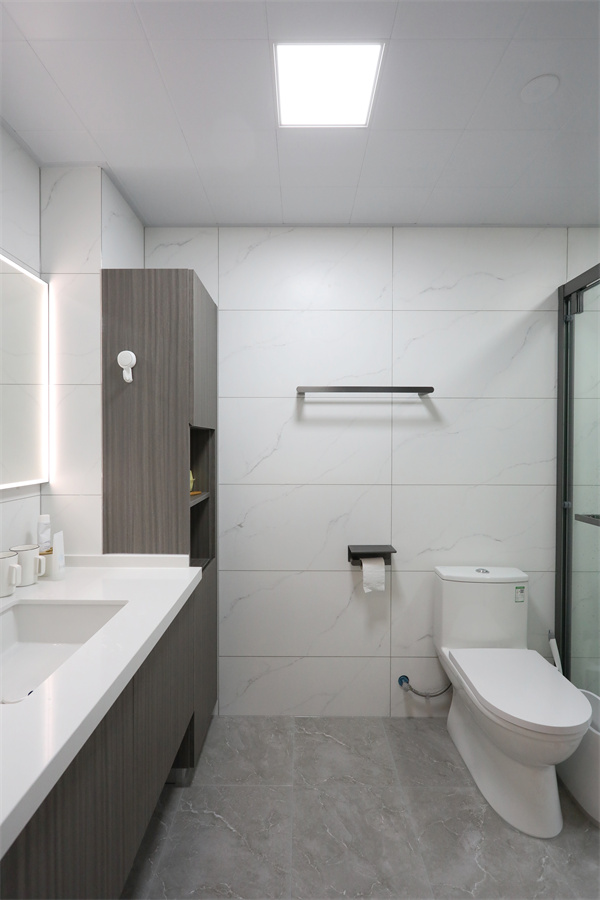 馬桶區簡化,臺盆收納與淋浴區為重點布局,更強調的是功能實用性。