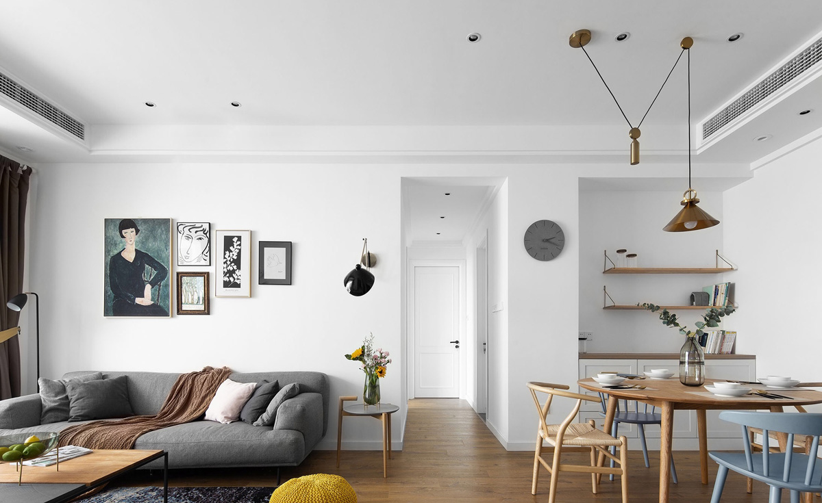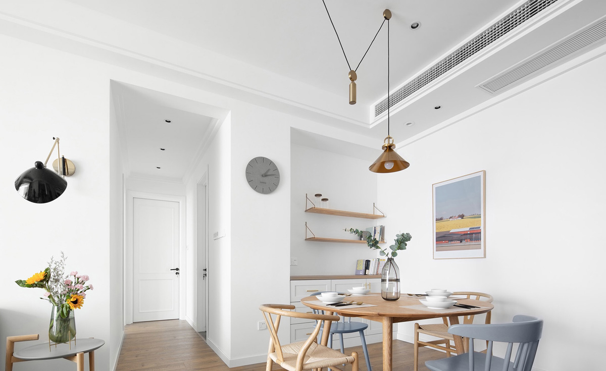 餐廳的設(shè)計(jì)墻面全部刷白色乳膠漆,從衛(wèi)生間偷出來的餐邊柜功能也非常實(shí)用。