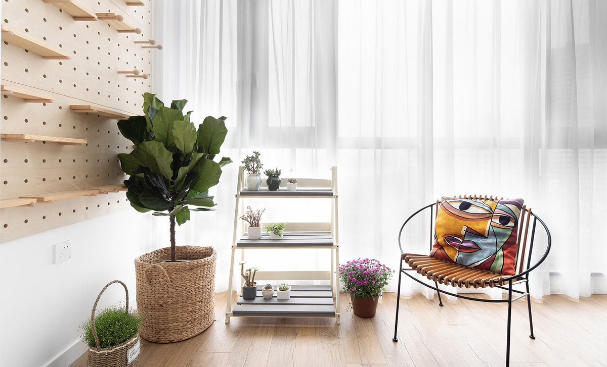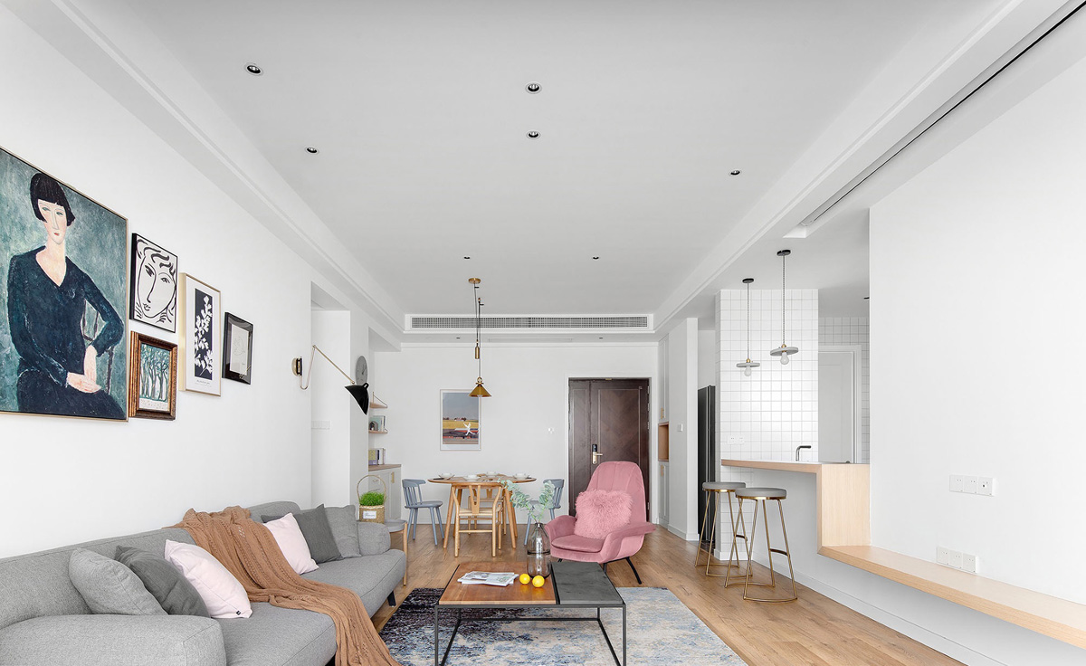 客廳部份地面已大面積地板為主,餐桌及椅子也是以實(shí)木為主,茶幾的搭配也是實(shí)木和素水泥的搭配,顯得空間更有質(zhì)感。拿掉電視背景墻來做吧臺(tái),使得廚房和客廳的連接更加有趣,因?yàn)楝F(xiàn)在大部分家庭都不在客廳看電視,所以也就弱化電視的功能。在做飯洗菜的時(shí)候和客廳的空間互動(dòng),也是另外一種感覺。軟裝搭配更多的是自由,隨性。