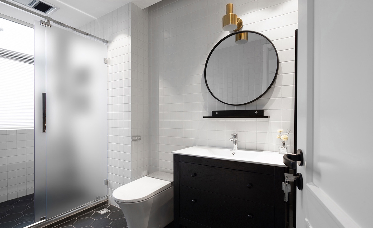 衛(wèi)生間以黑色金色為基調(diào),洗臉柜及鏡子是到網(wǎng)上淘的,質(zhì)量也還不錯(cuò)。