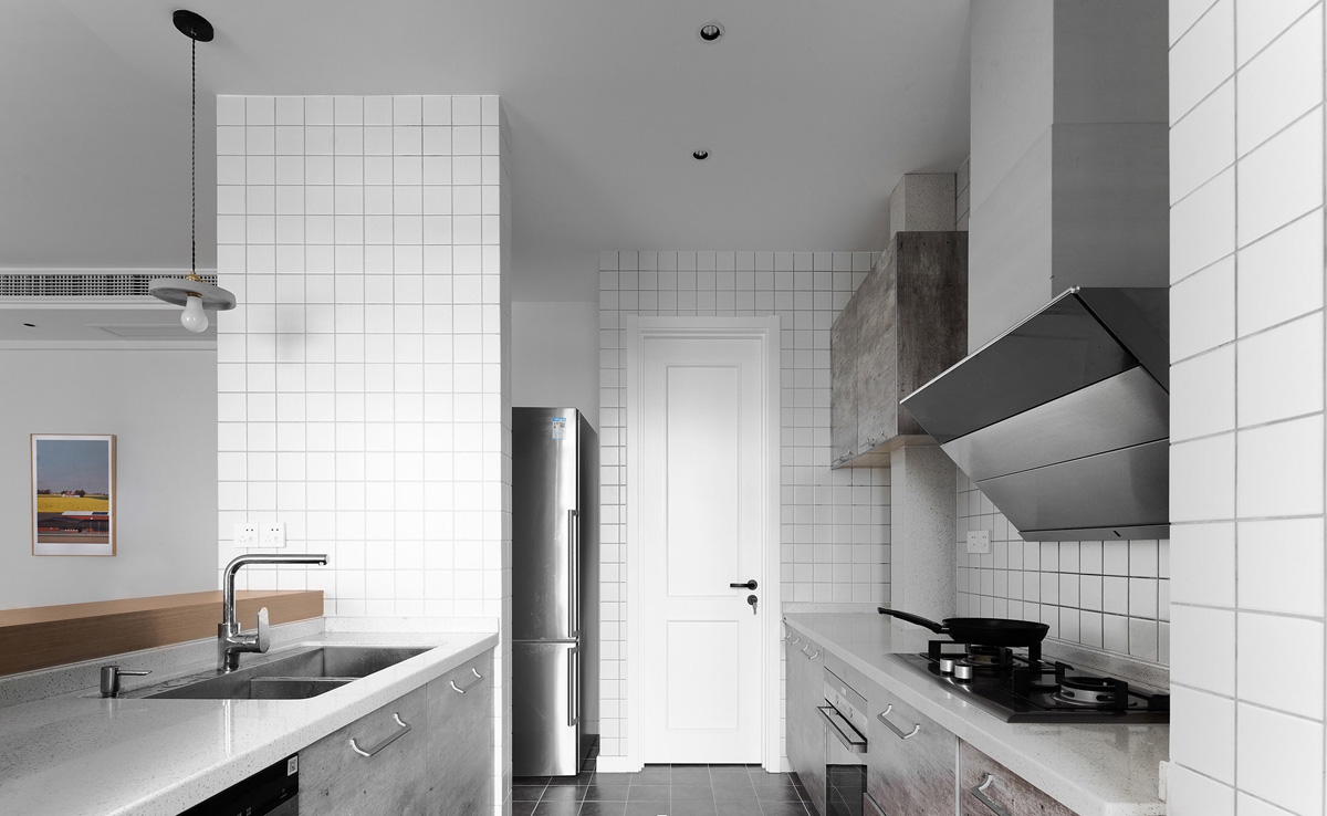 廚房的搭配以自然色位置,墻面是10*10白色小白磚,地面是30*30的黑色磚,廚柜是防水泥色的門板,廚房旁邊設(shè)計(jì)了一個(gè)雜物間兼食品柜,對(duì)于居家家庭來說是一個(gè)必不可少的空間。