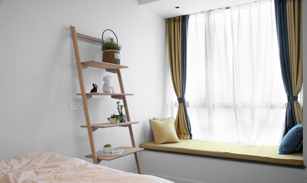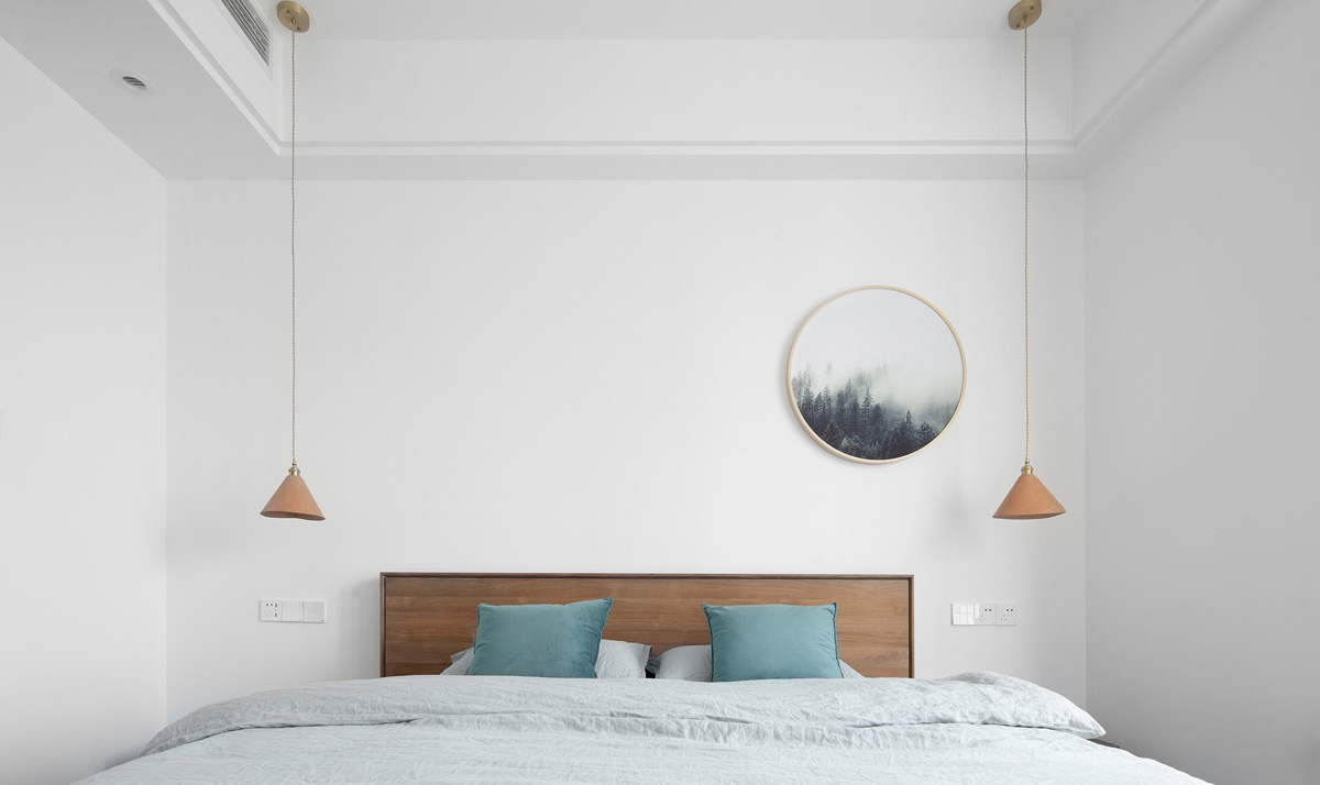 主臥室用了一張榆木的床,配了素色的床品,干凈有質(zhì)感,墻面上的裝飾畫用一幅圓形的云霧山畫,讓臥室顯得更加有意境,臥室和書房之間是用了一個(gè)窄邊框的玻璃門來做隔斷,開空調(diào)的時(shí)候更加節(jié)能。