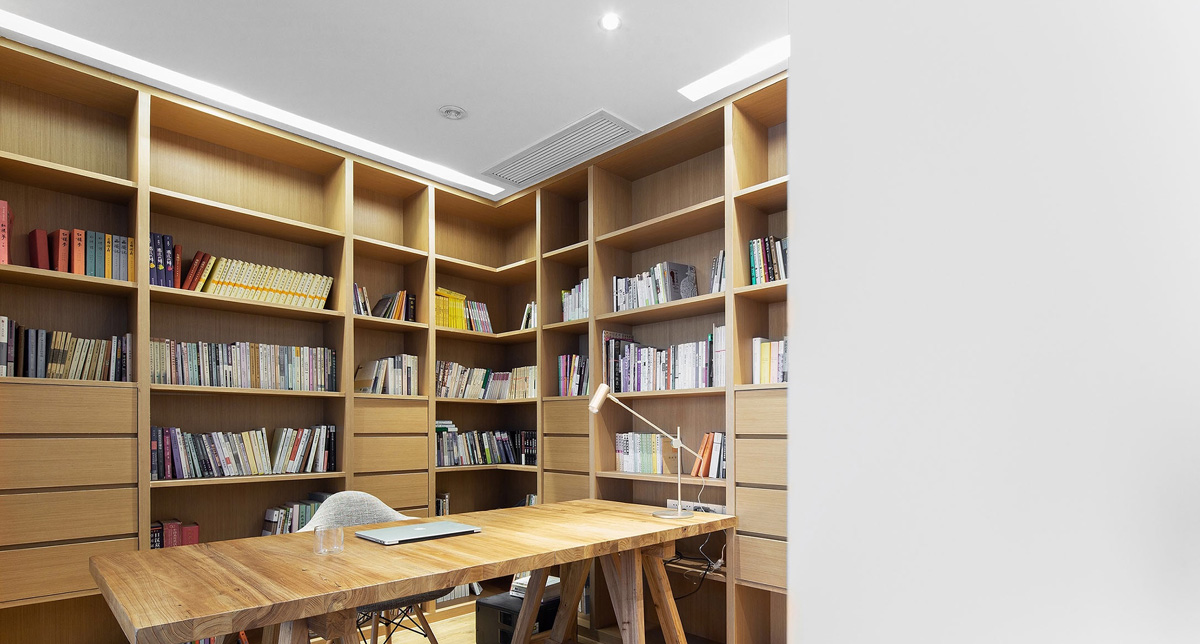 書房是業(yè)主使用頻率最高的地方,柜子也是設(shè)計(jì)好現(xiàn)場(chǎng)制作的,滿足要放打印機(jī)和抽屜,各個(gè)高度書籍的功能,色調(diào)以原木為主。